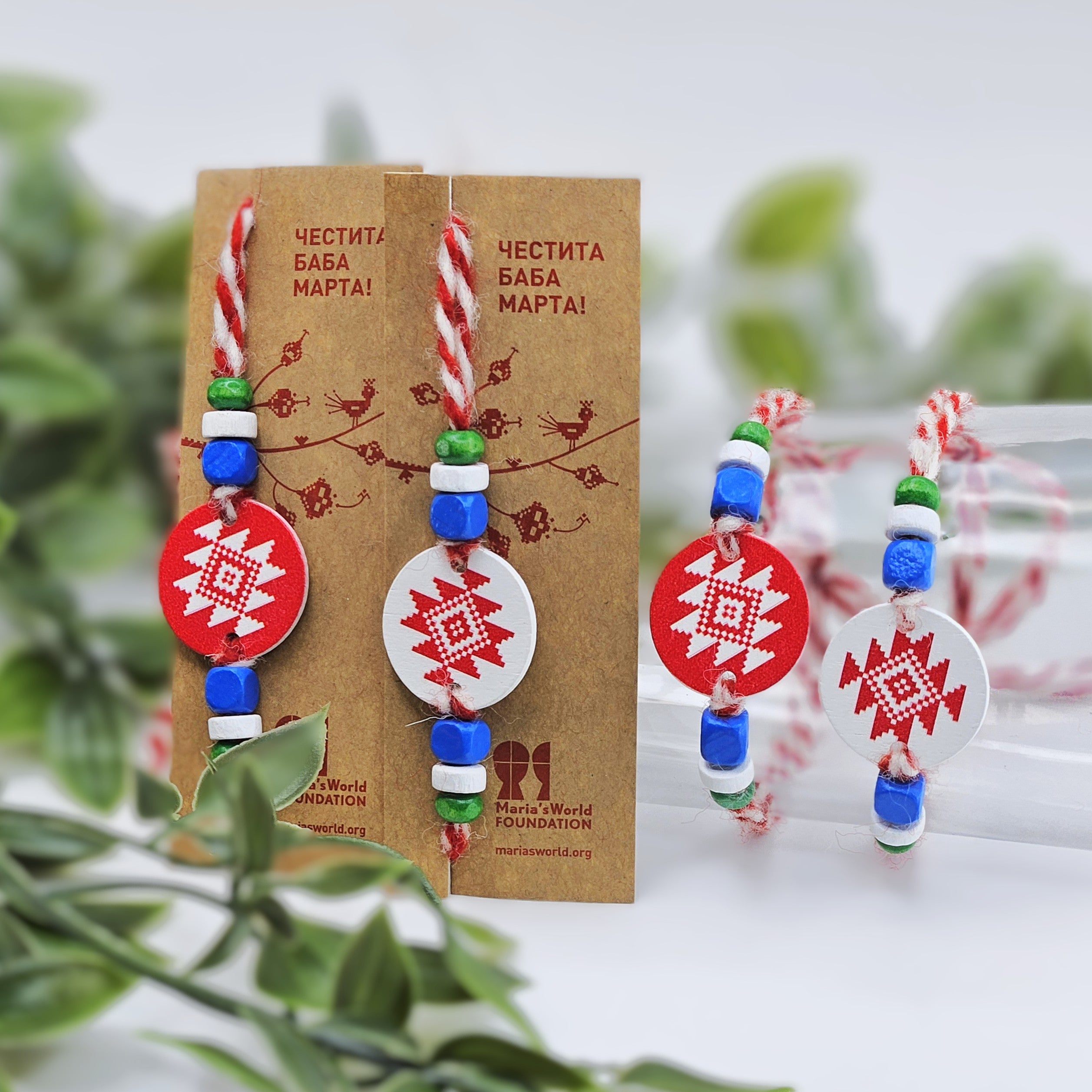 2 броя мартеници за ръка с традиционно пресукана бяла и червена вълна; кръгъл дървен елемент с мотив шевица в червено и бяло, допълнен с разноцветни дървени мъниста.