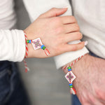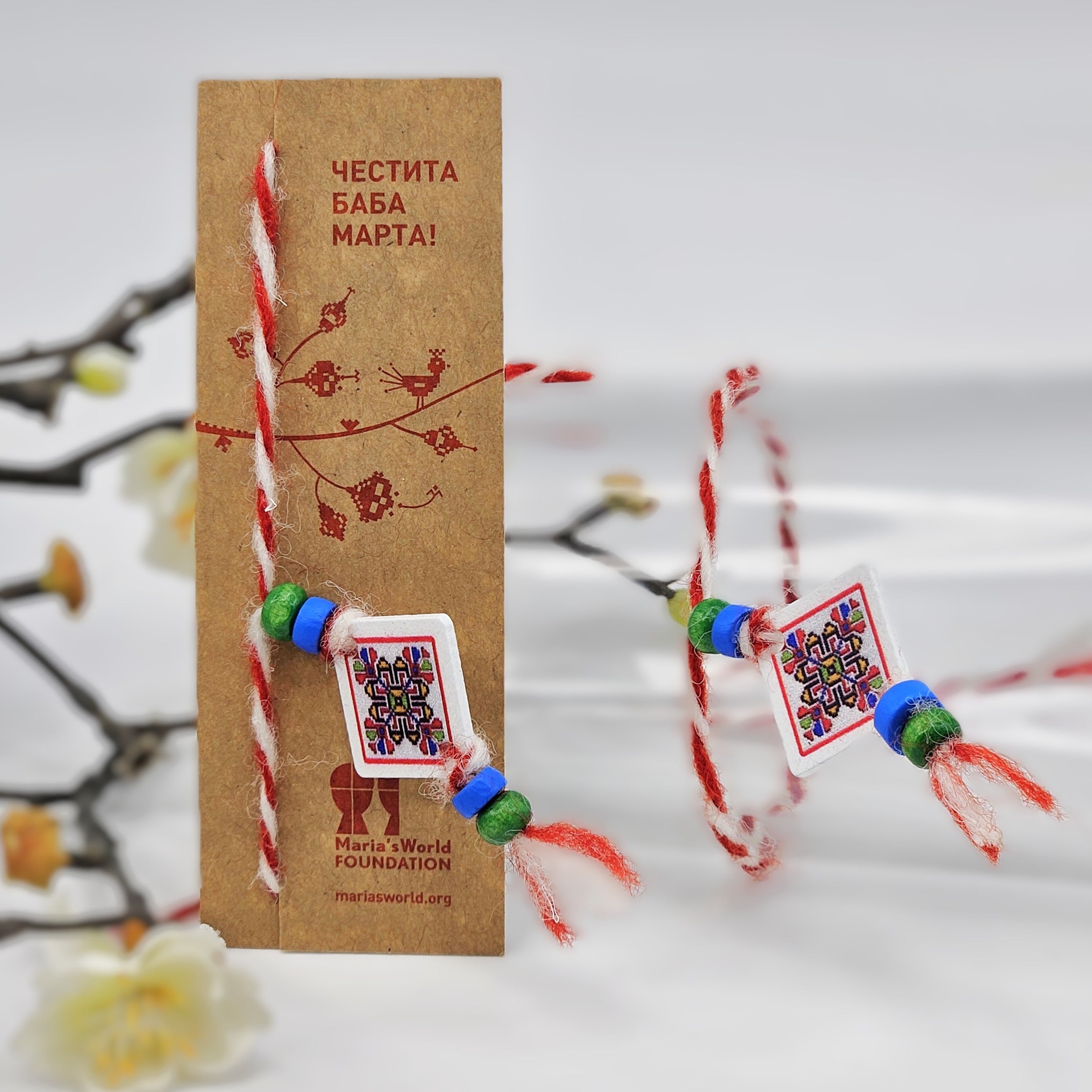 Ръчно изработена мартеница с традиционно пресукана бяла и червена вълна; дървен елемент с мотив шевица, допълнен със зелени и сини дървени мъниста и малък пискюл.