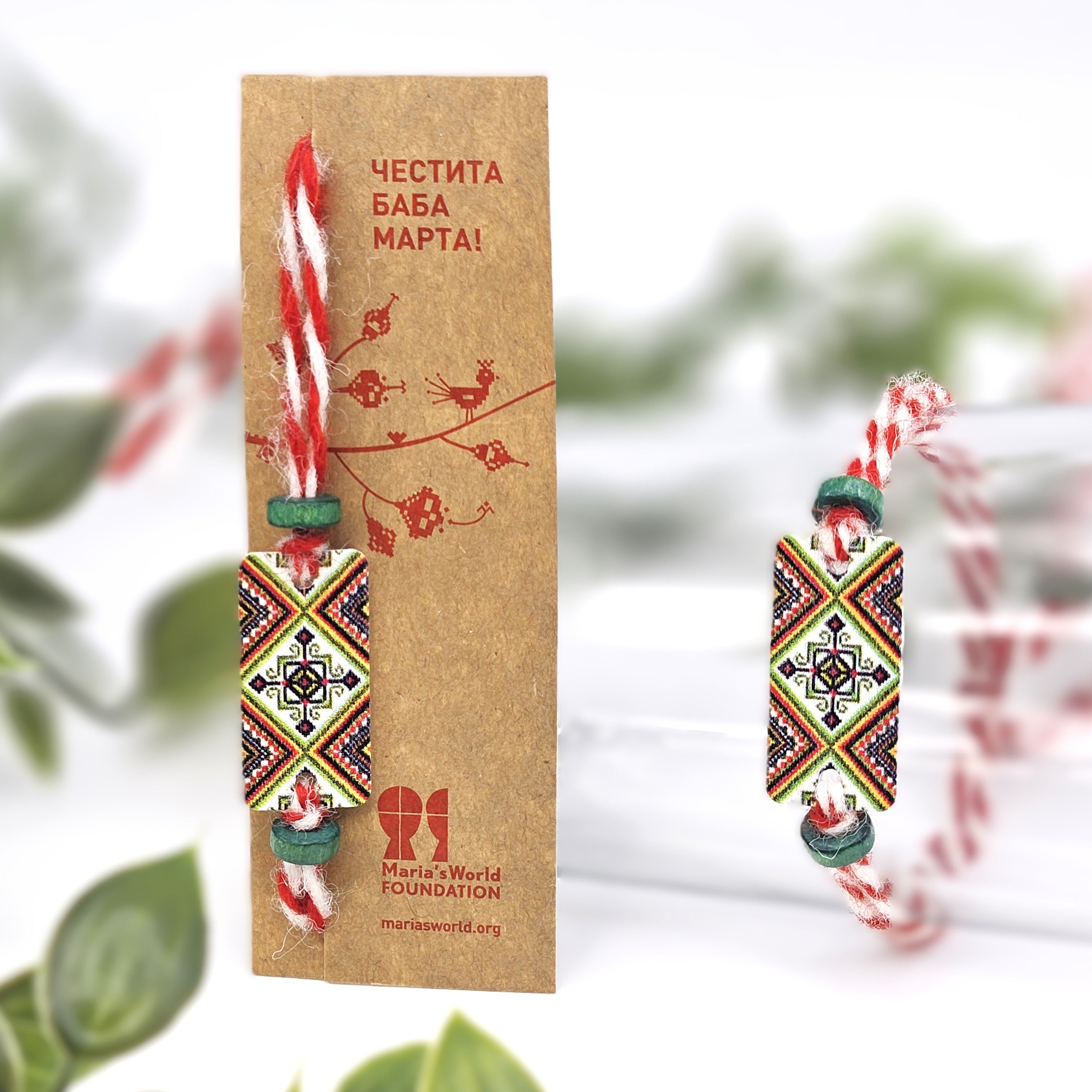 Ръчно изработена мартеница с традиционно пресукана бяла и червена вълна; дървен елемент с мотив шевица, допълнен с червени и бели дървени мъниста.