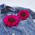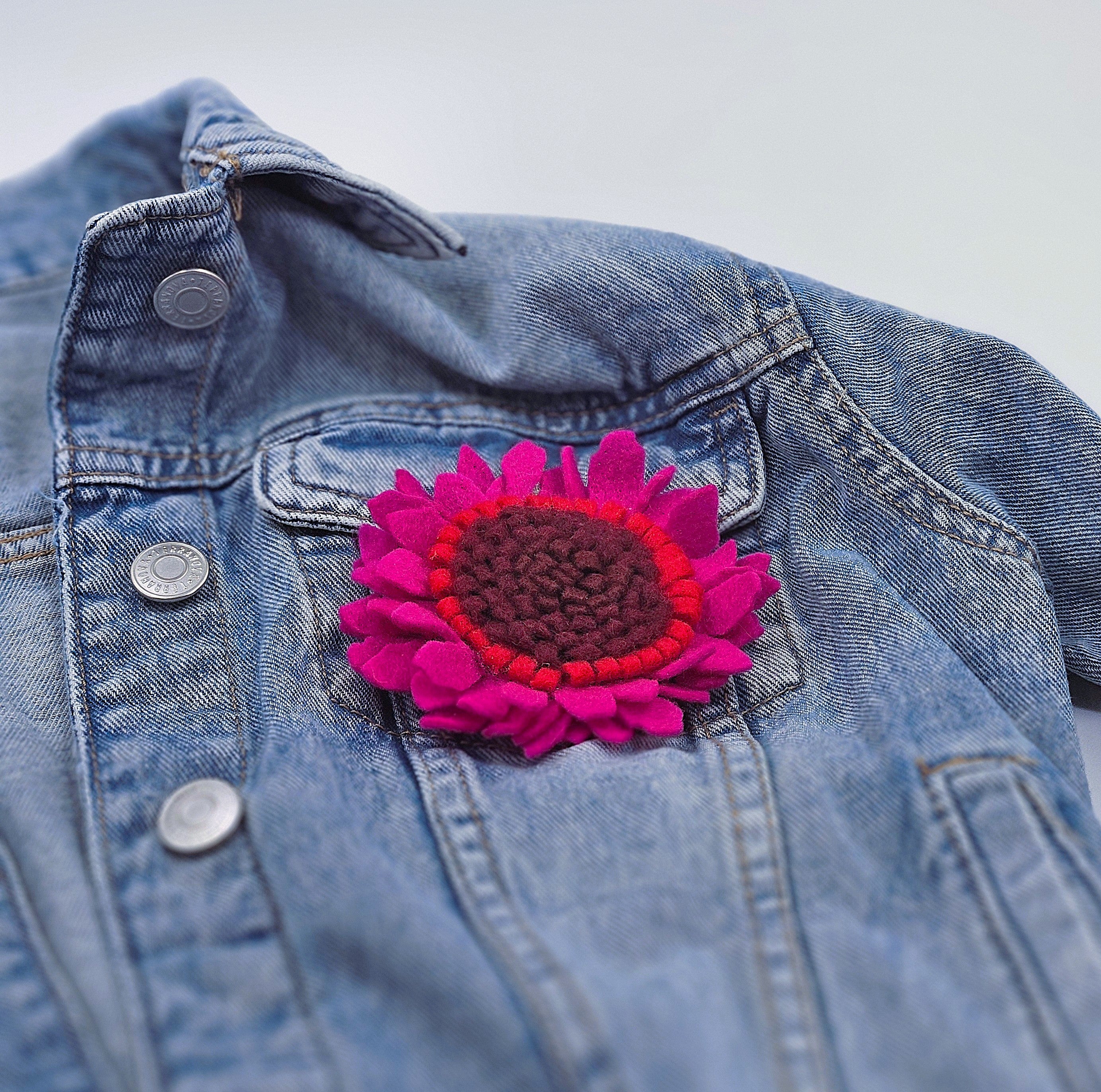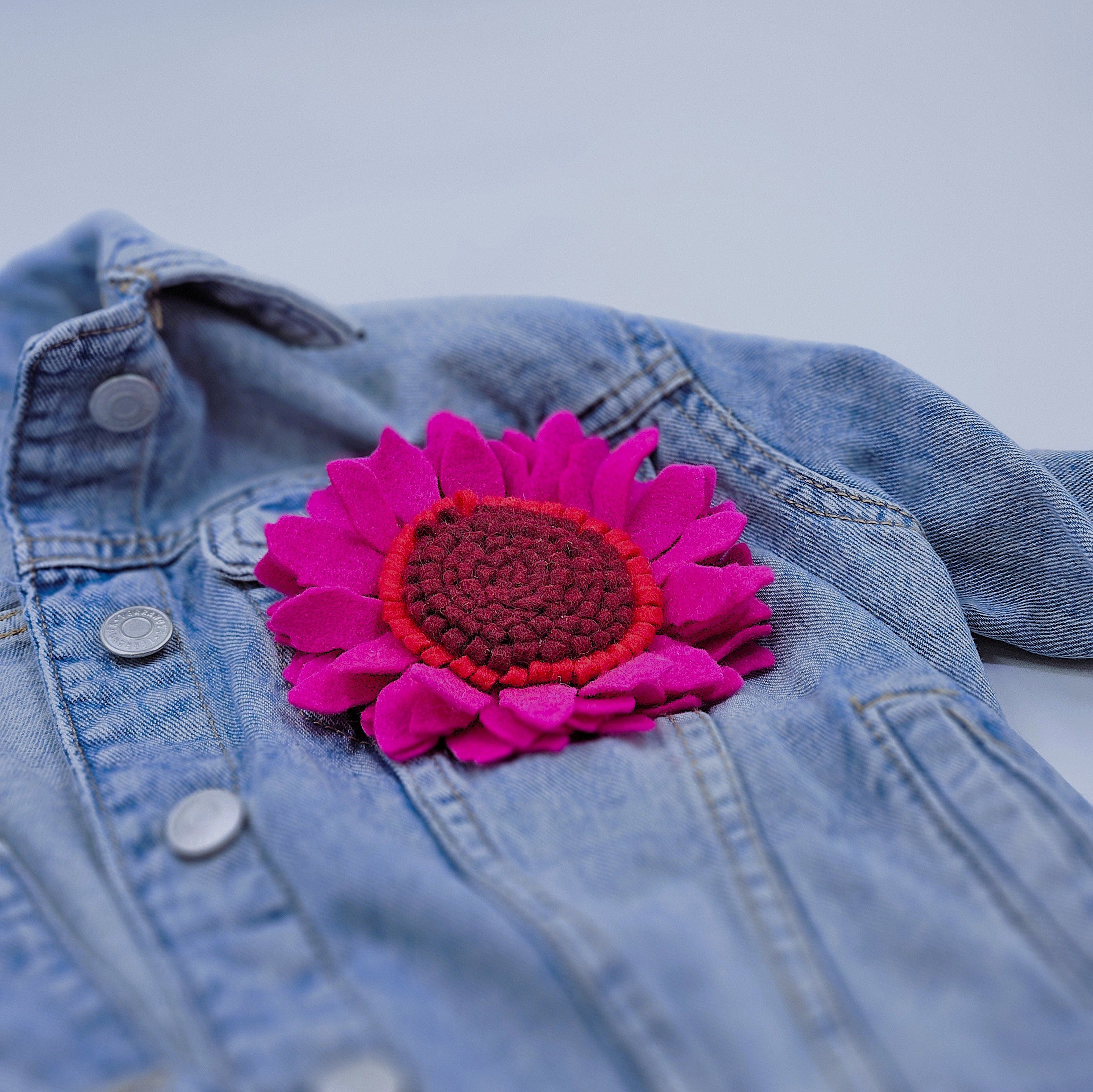 Брошка гербер от филц, в цикламено, червено и бордо.