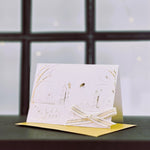 Ръчно изработена картичка с релефен зимен пейзаж с позлата и елегантна панделка. Картичката се предлага със златен пощески плик.