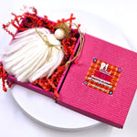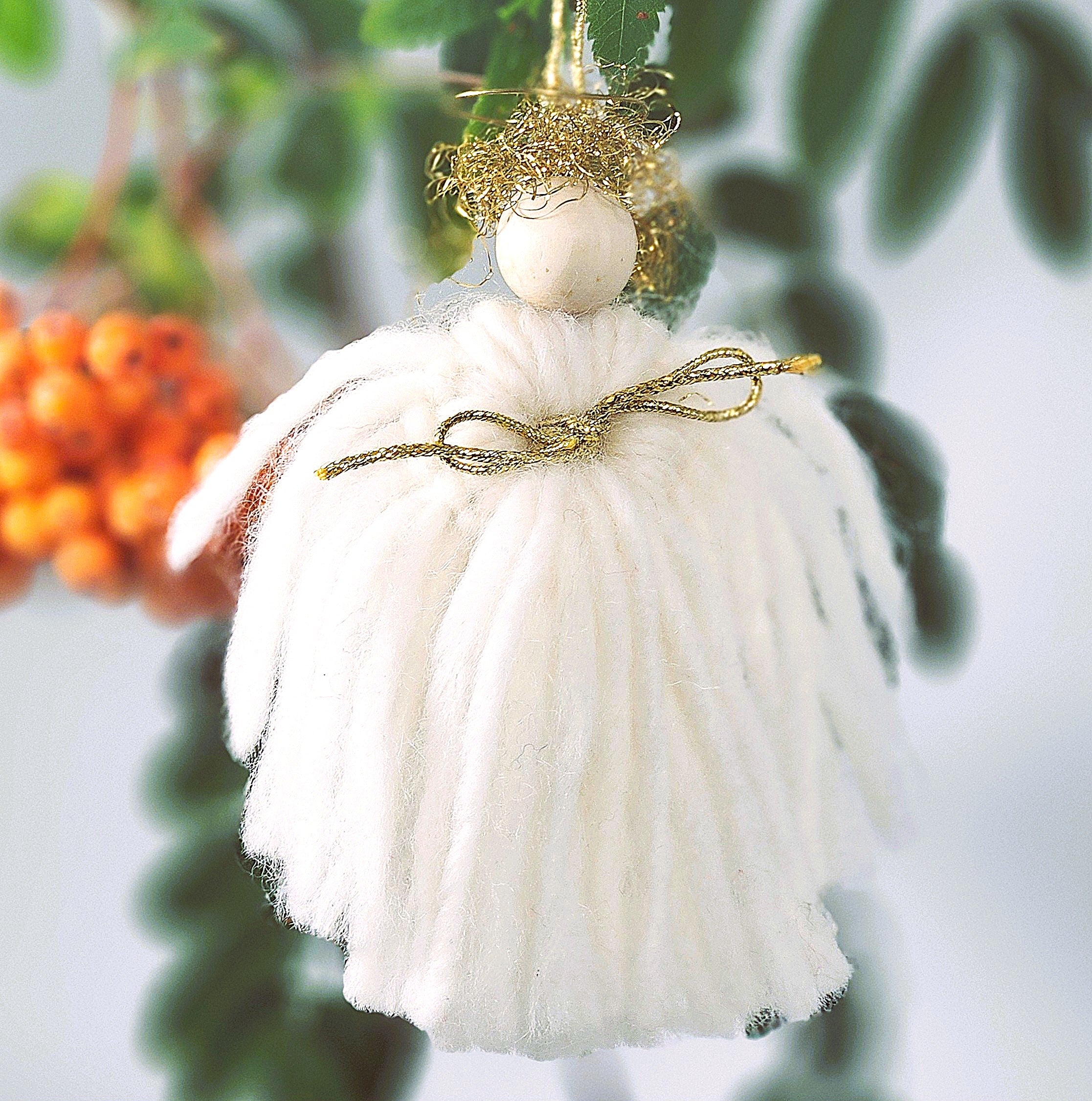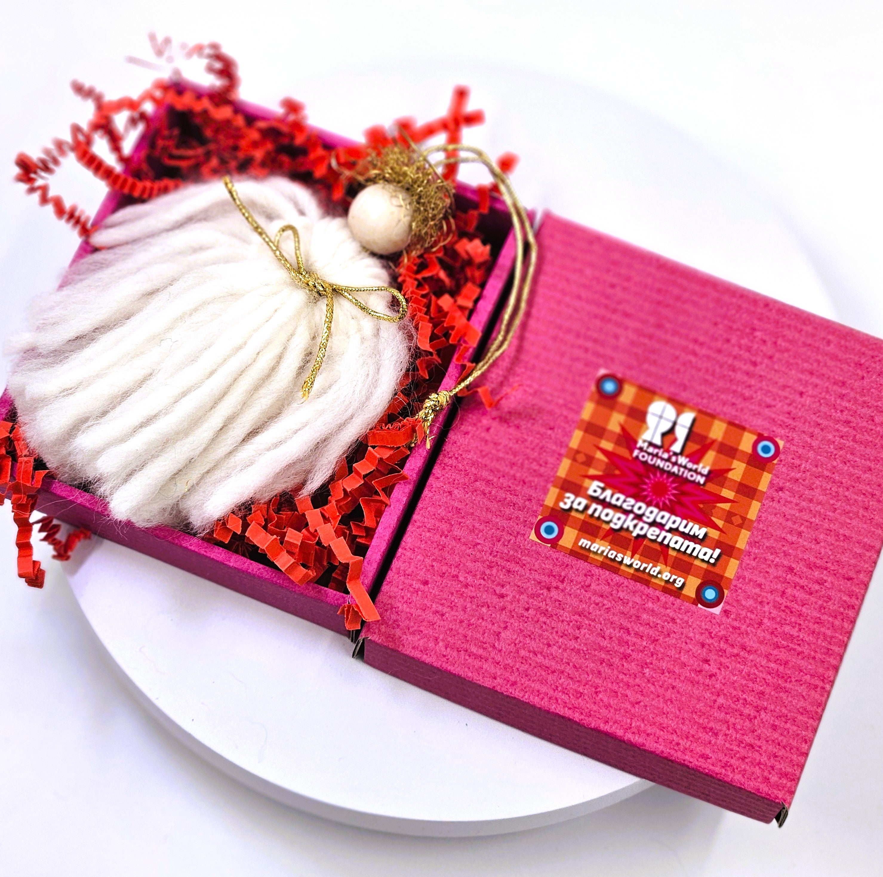 Висулка ангелче, изработено от бели и златни вълнени конци. Красиво опаковано в елегантна черна кутия с хартиени стърготини.