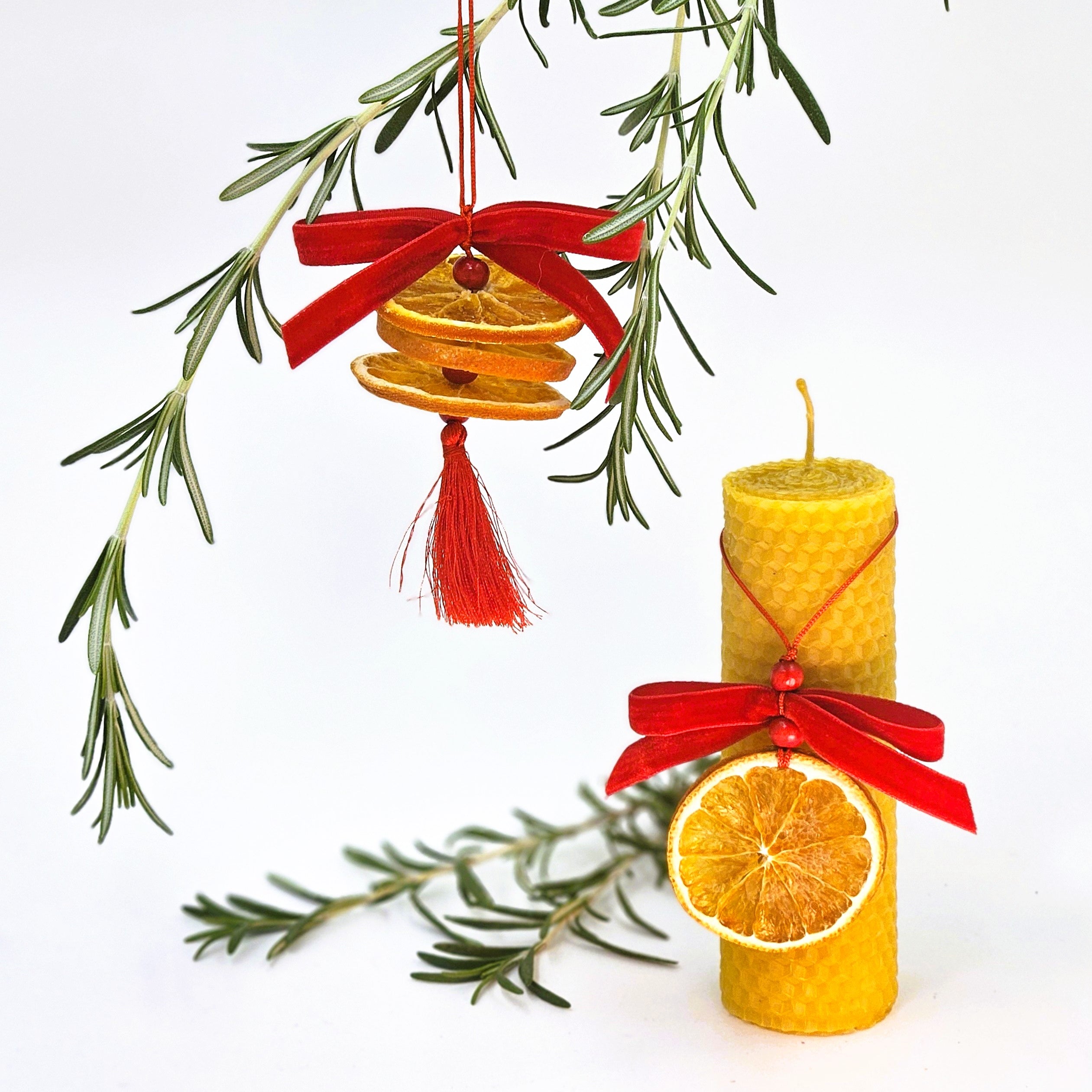 Комплект от свещ и висулка с елегантна декорация от портокал и червена кадифена панделка