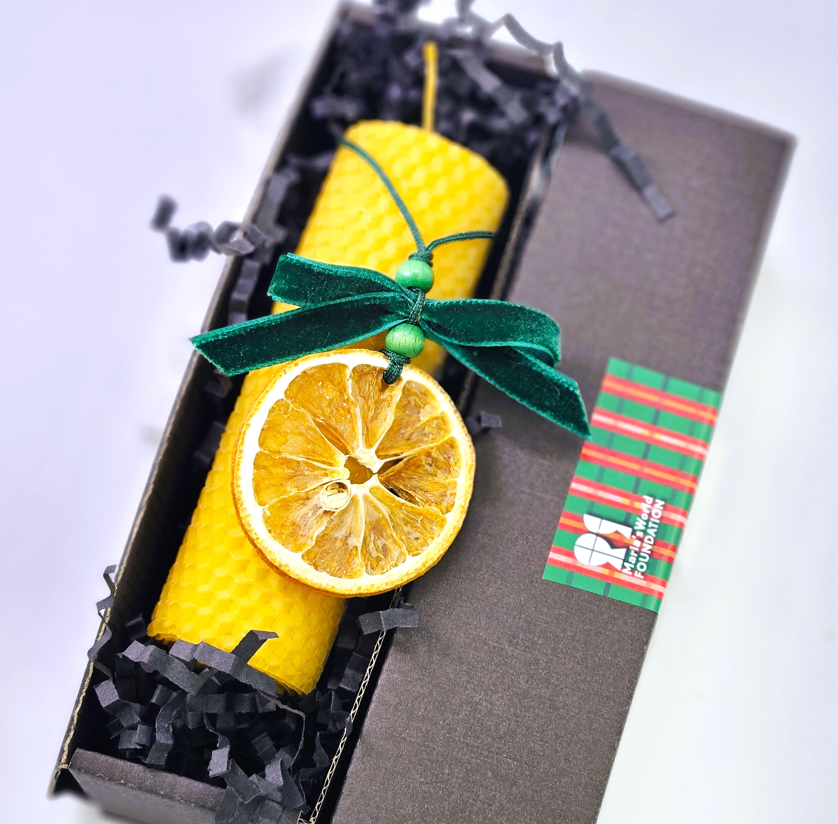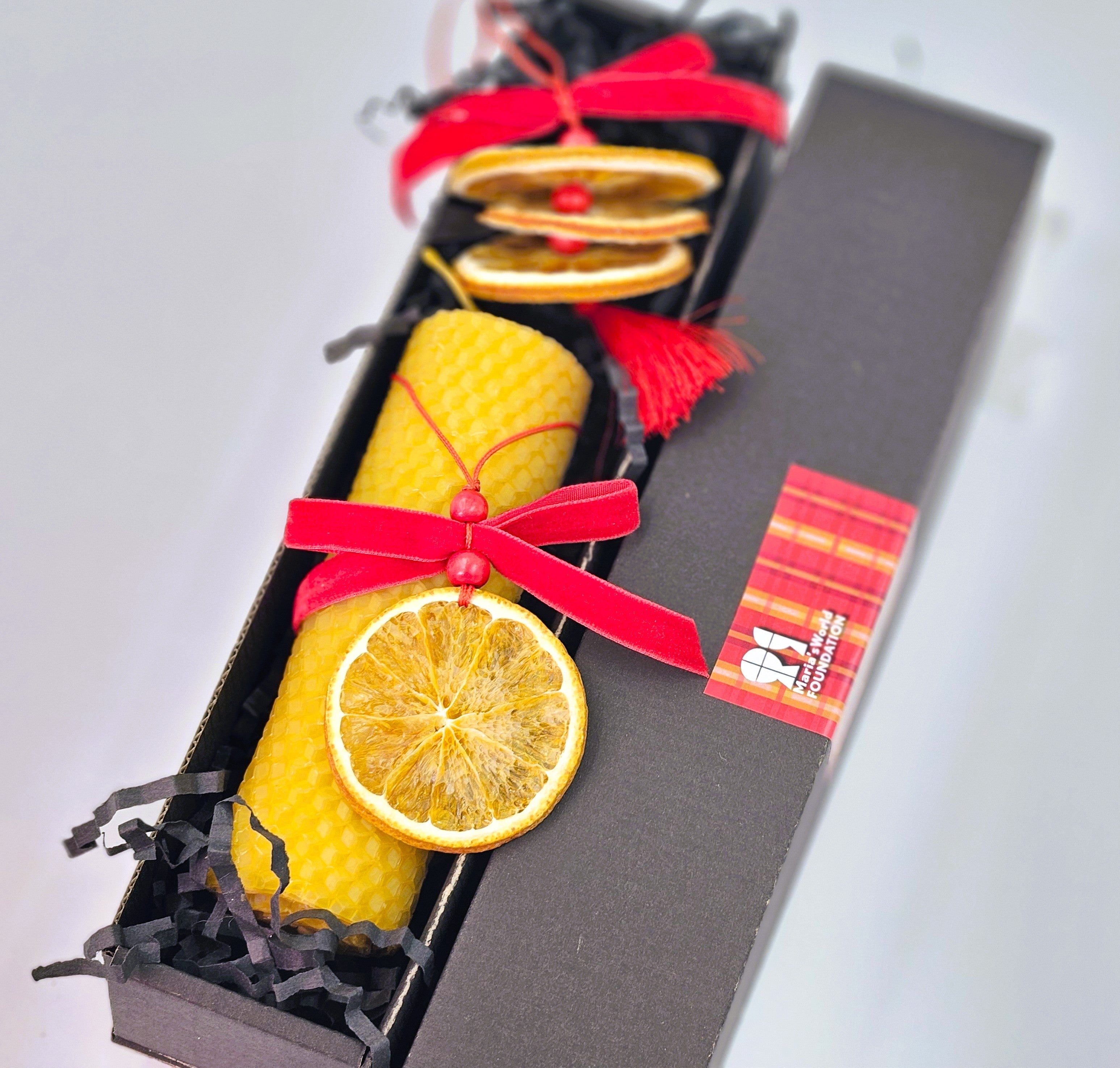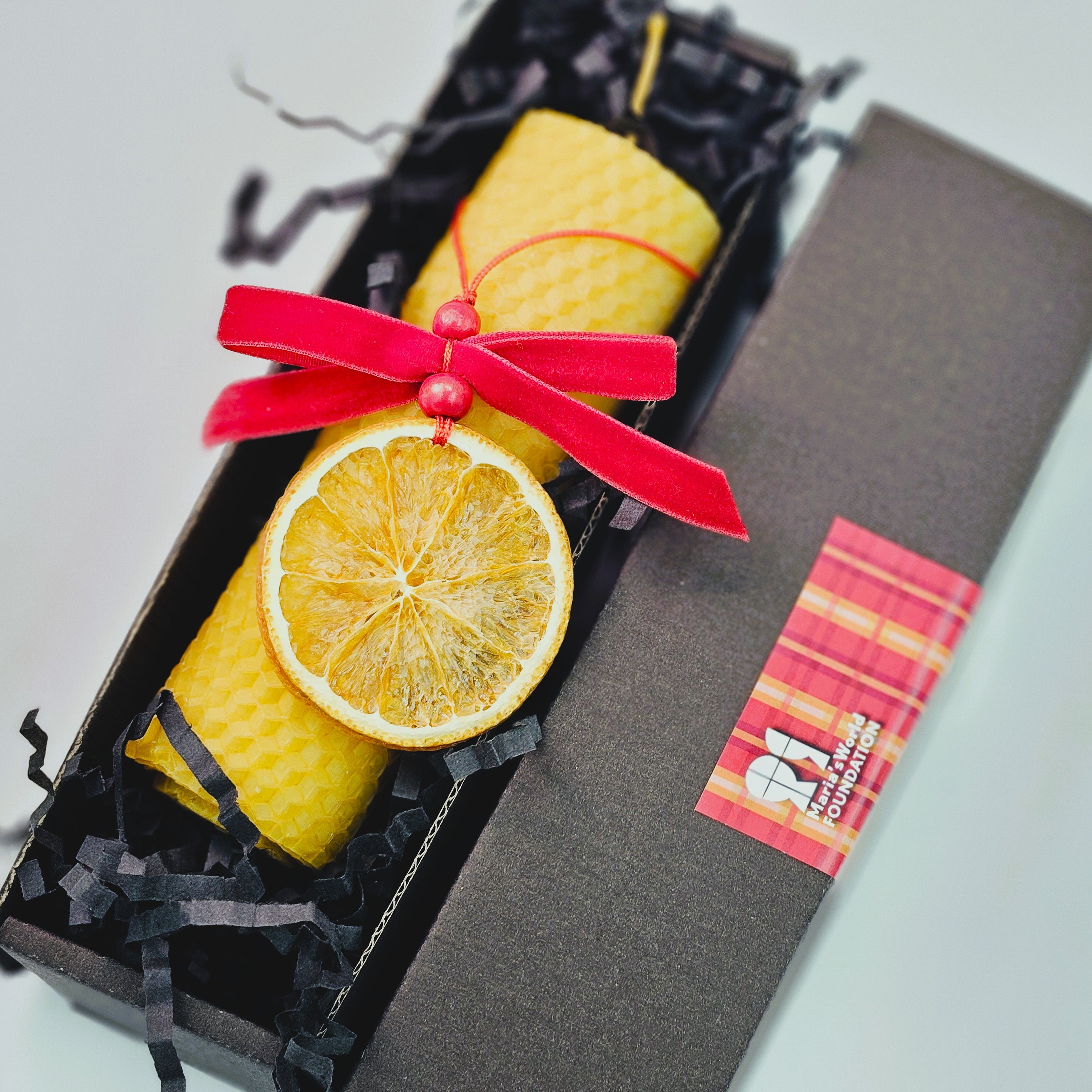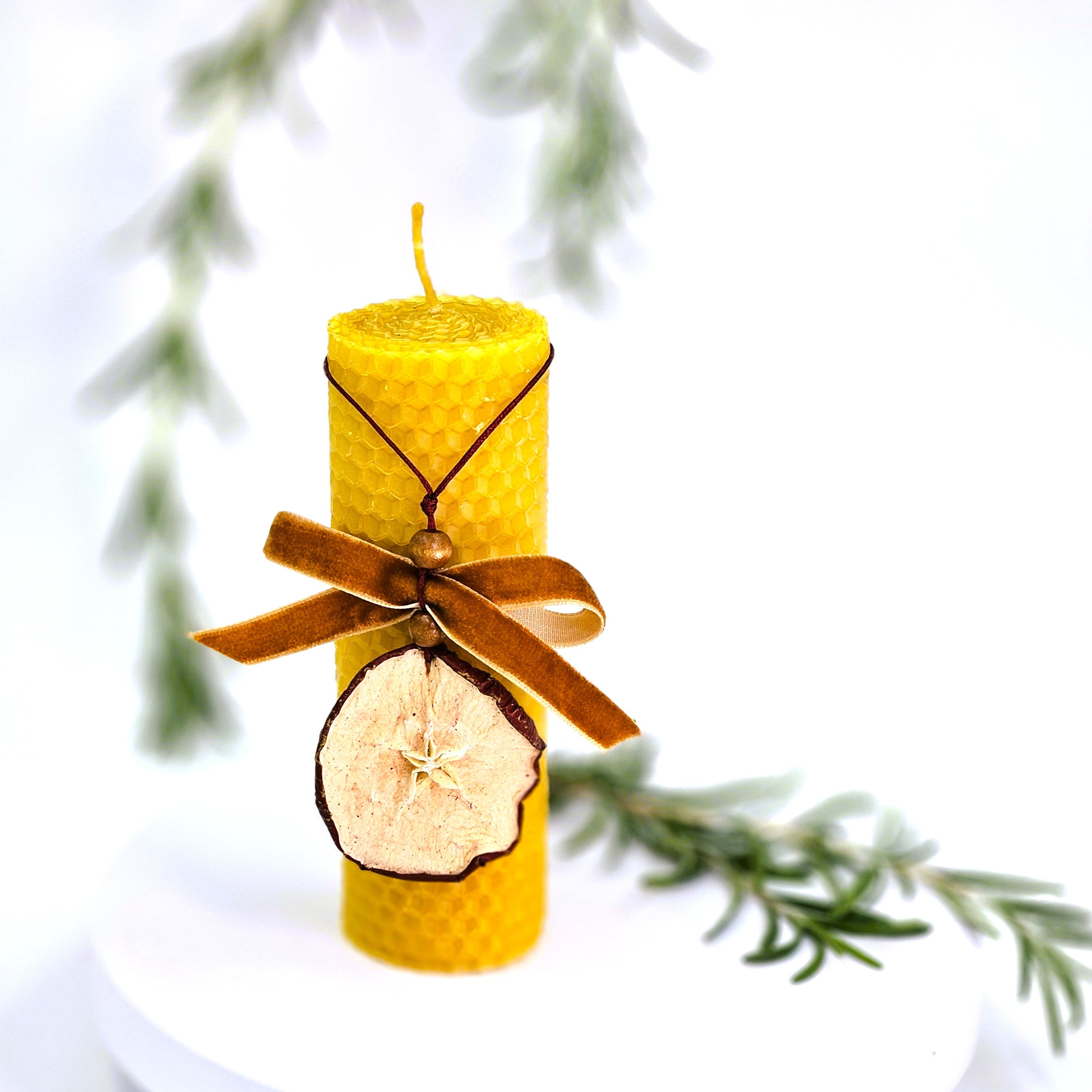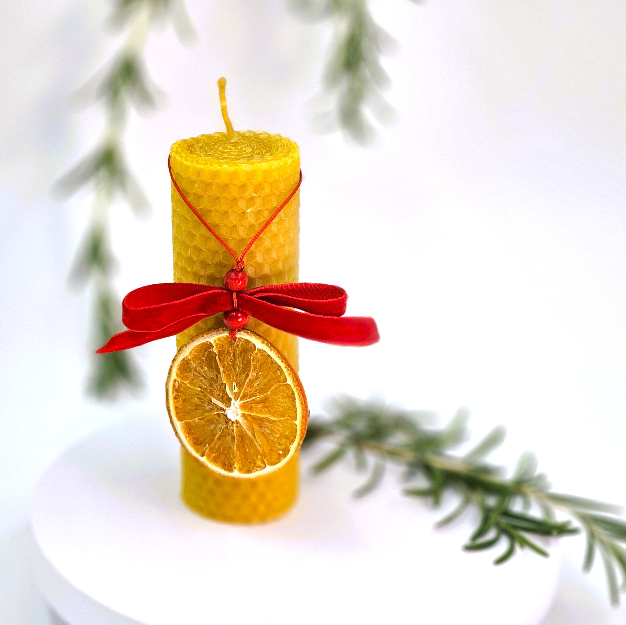 Свещ от пчелен восък с декорация портокал и червена панделка