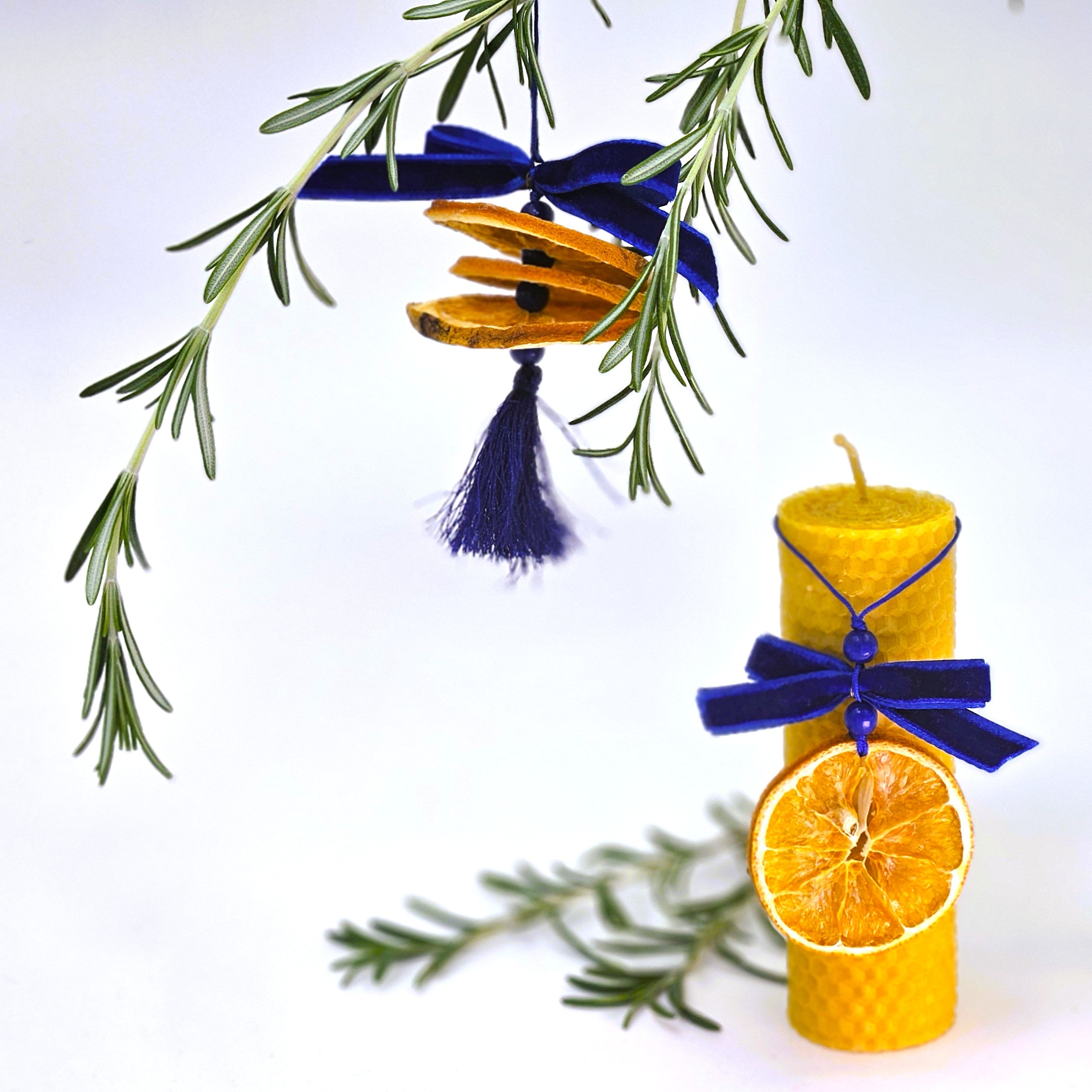 Комплект от свещ и висулка с елегантна декорация портокал и синя кадифена панделка