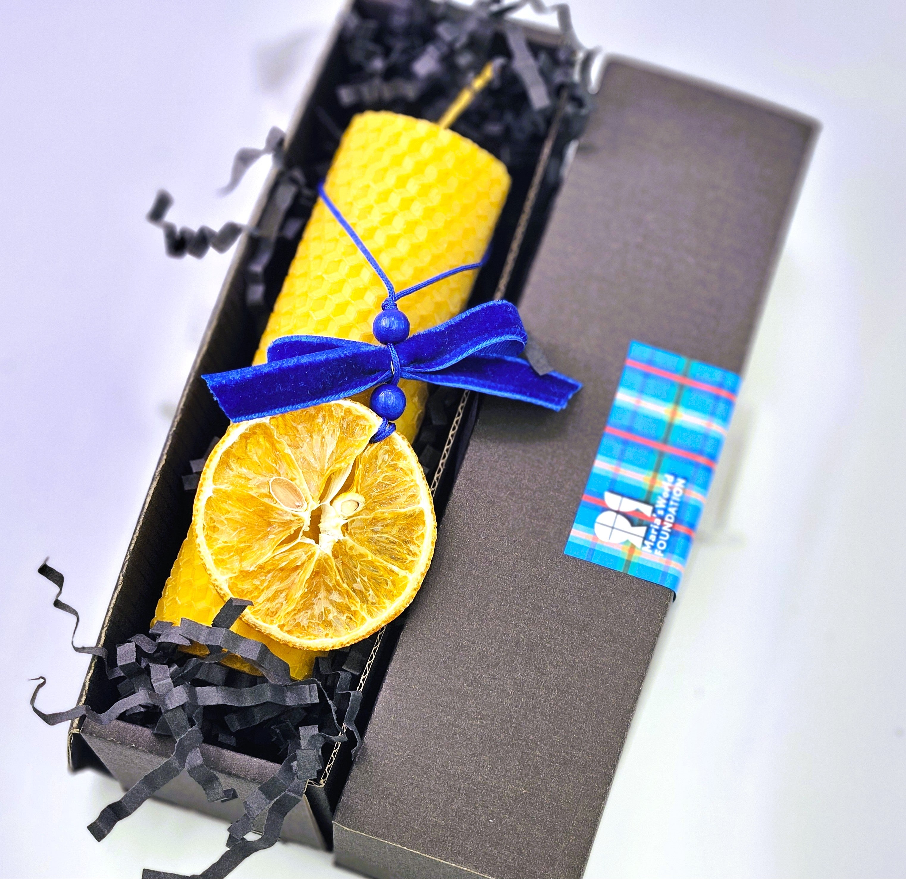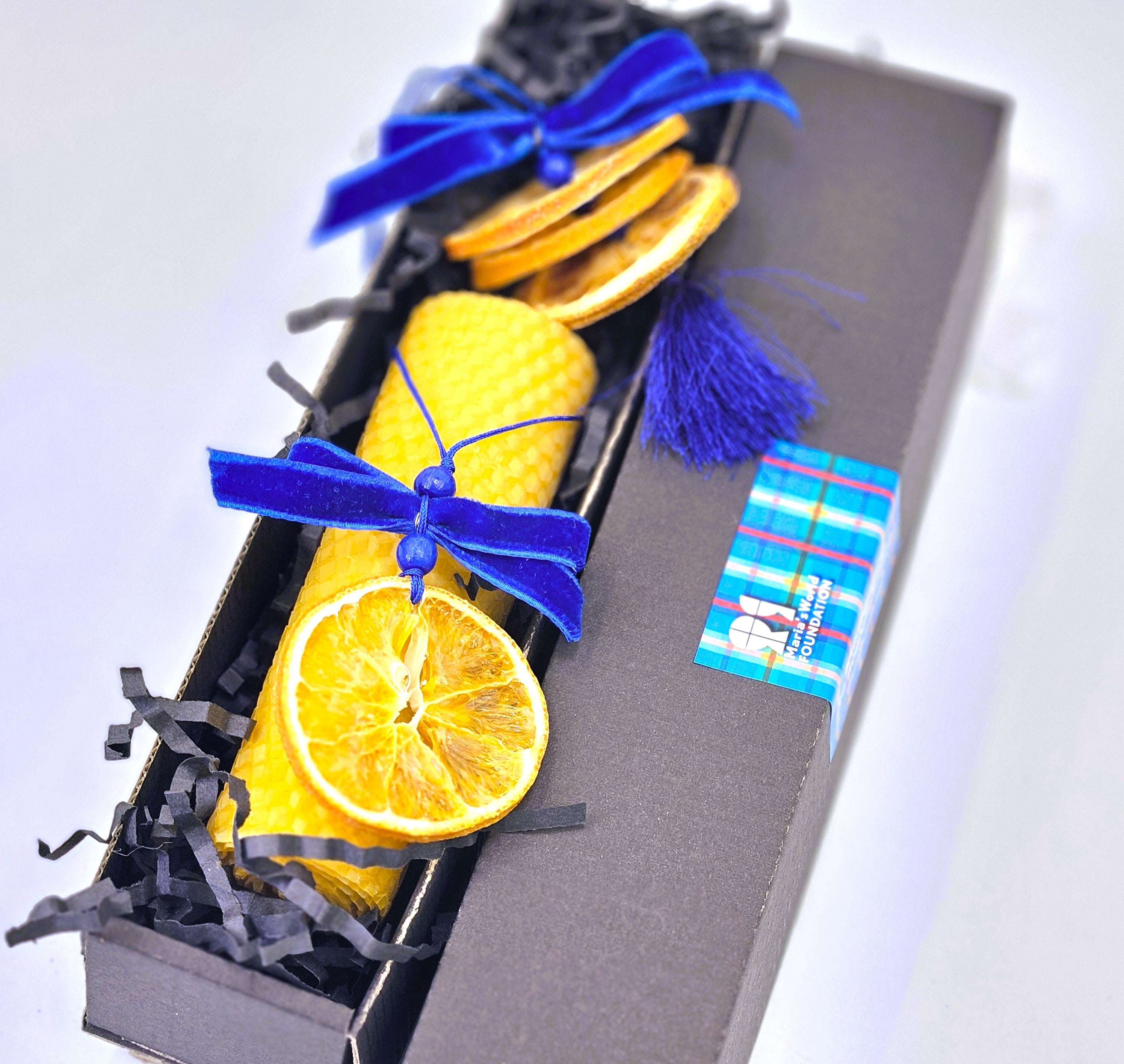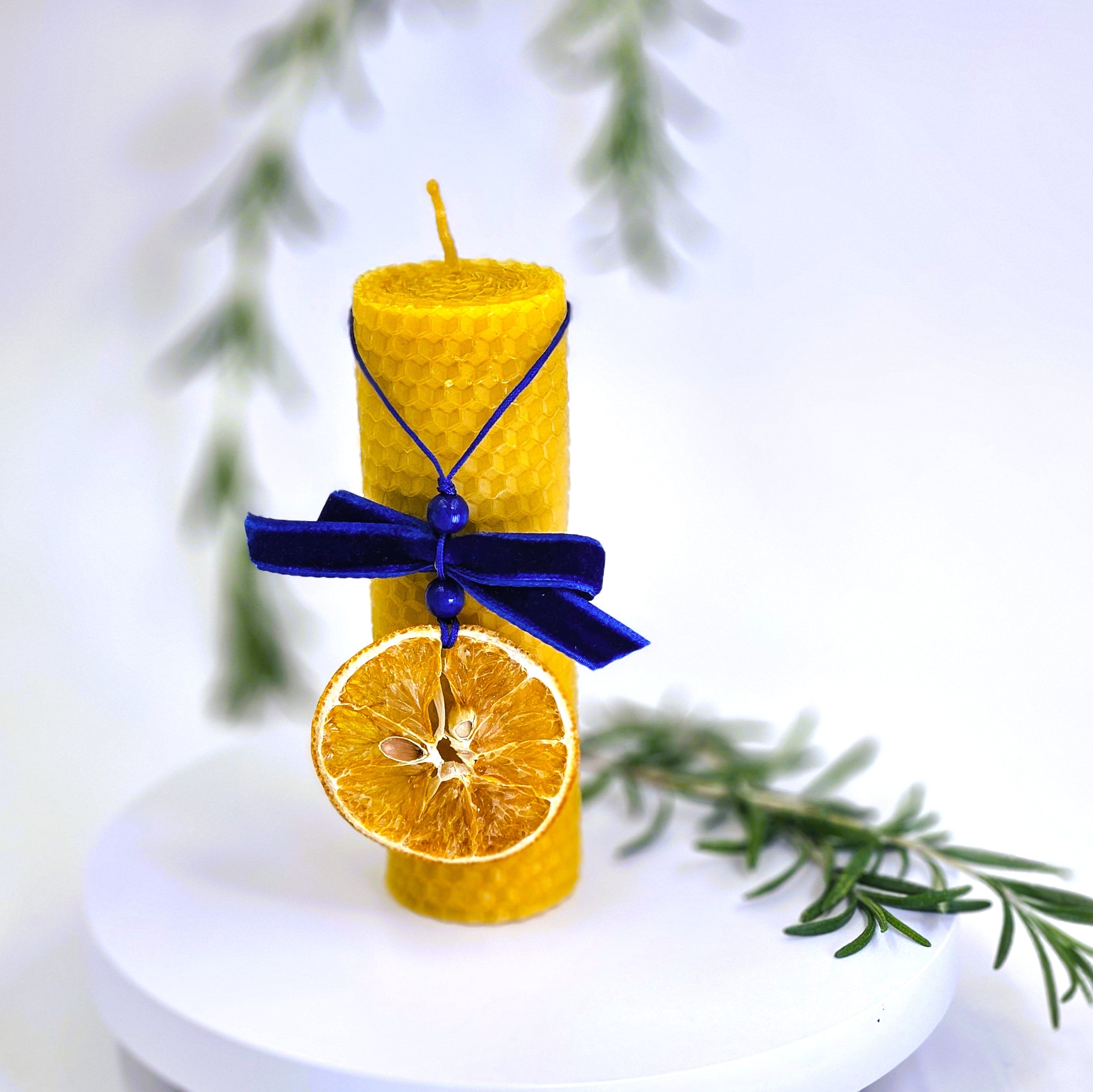 Свещ от пчелен восък с декорация портокал и синя кадифена панделка