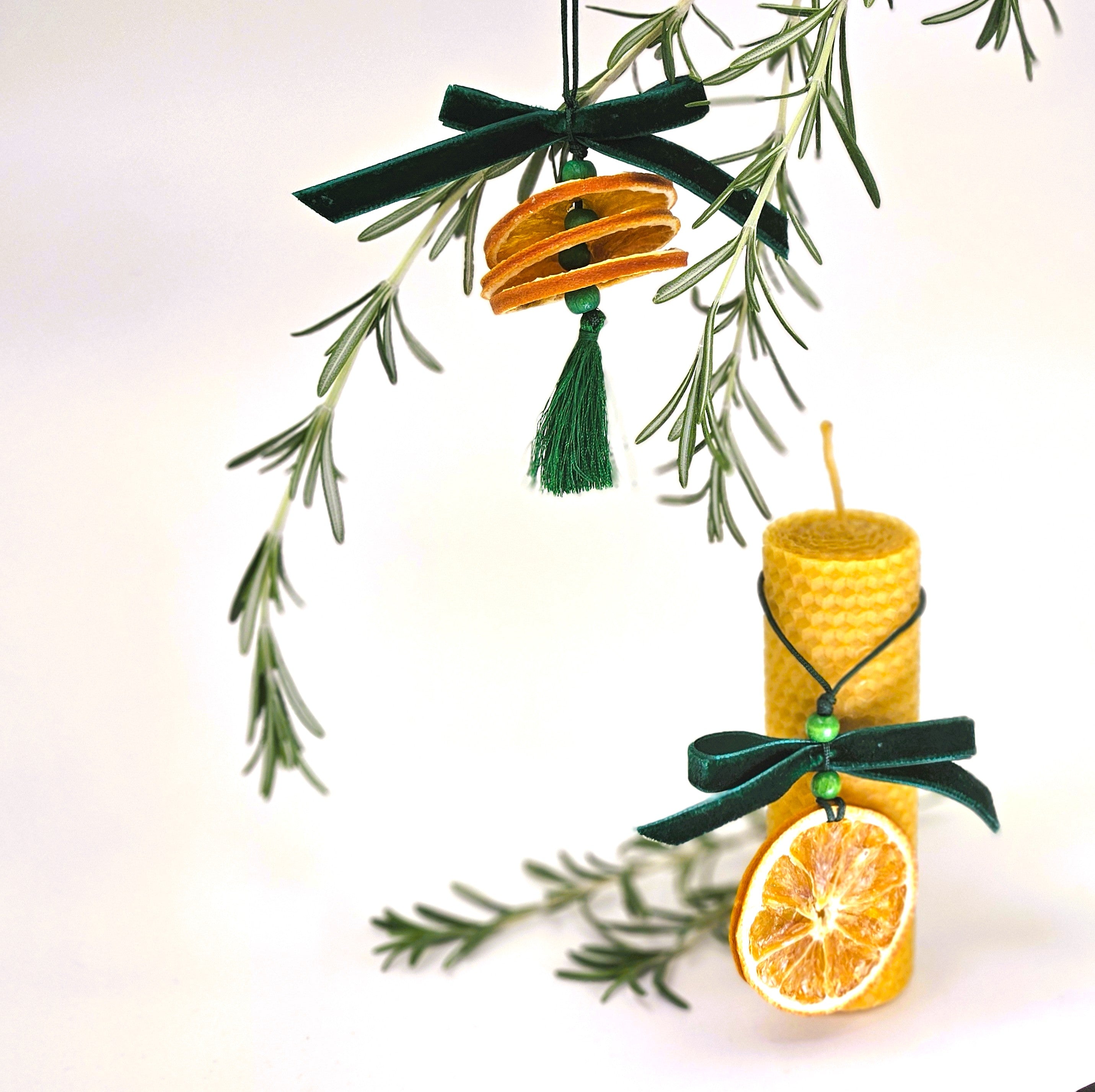 Комплект от свещ и висулка с елегантна декорация портокал и зелена кадифена панделка