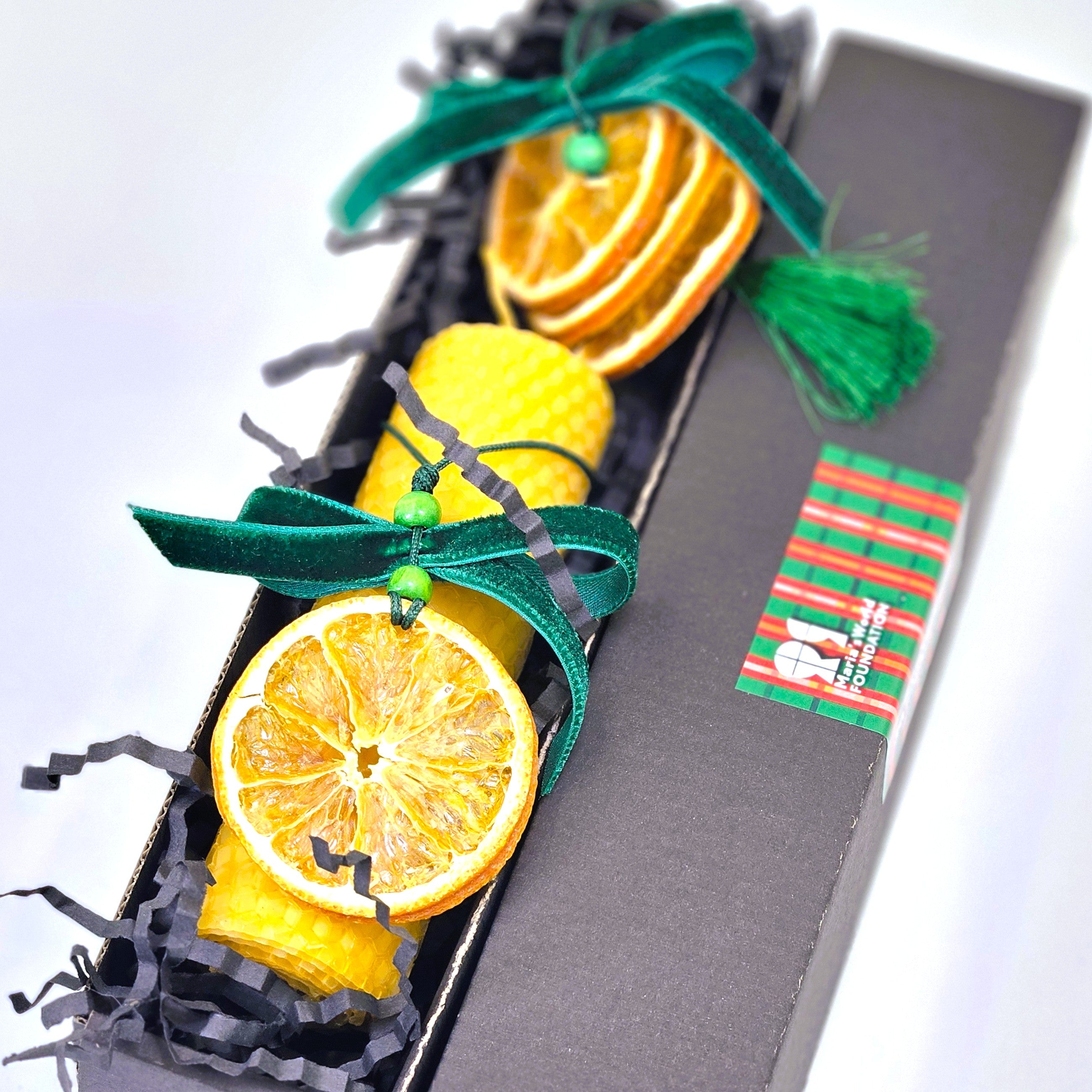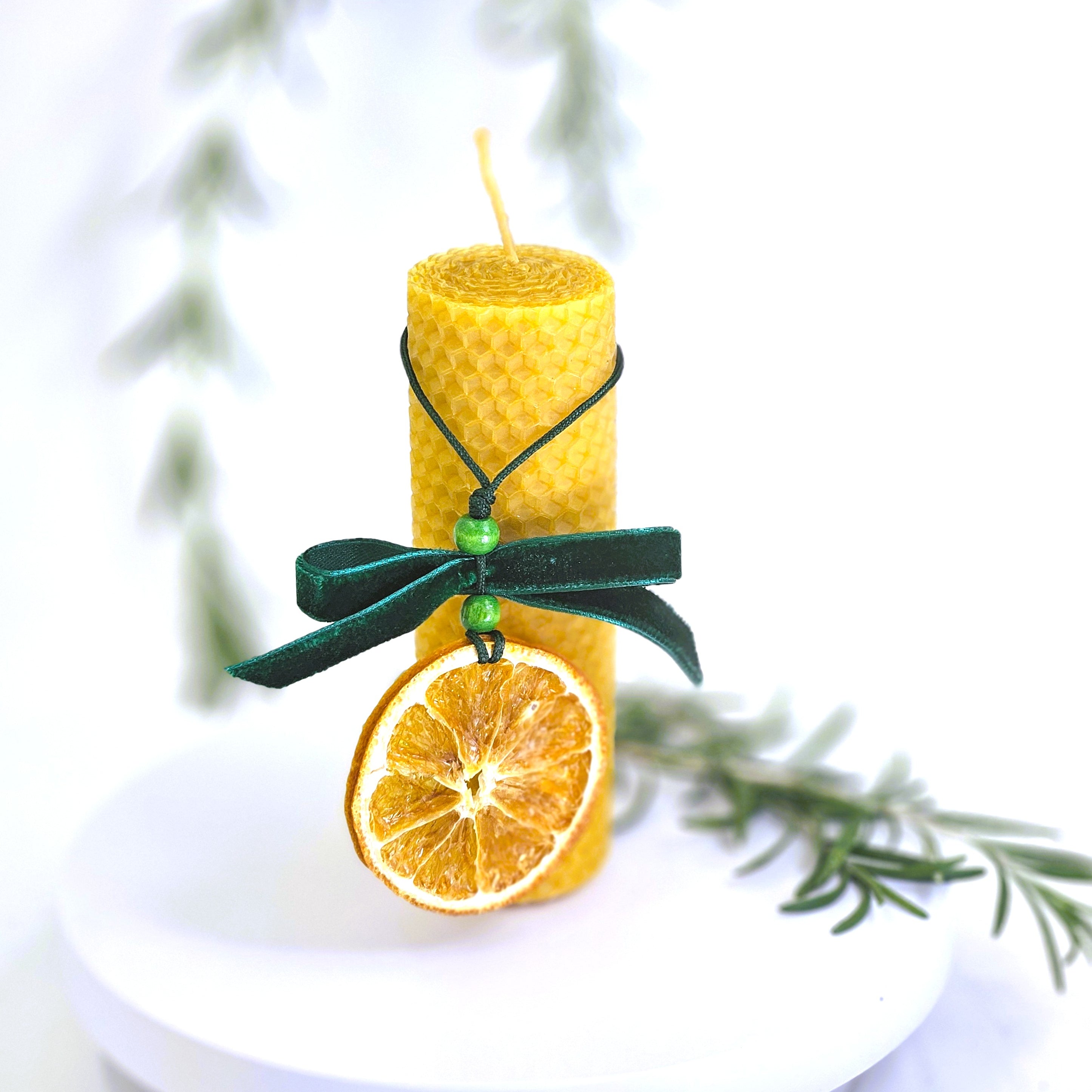 Свещ от пчелен восък с декорация портокал и зелена кадифена панделка