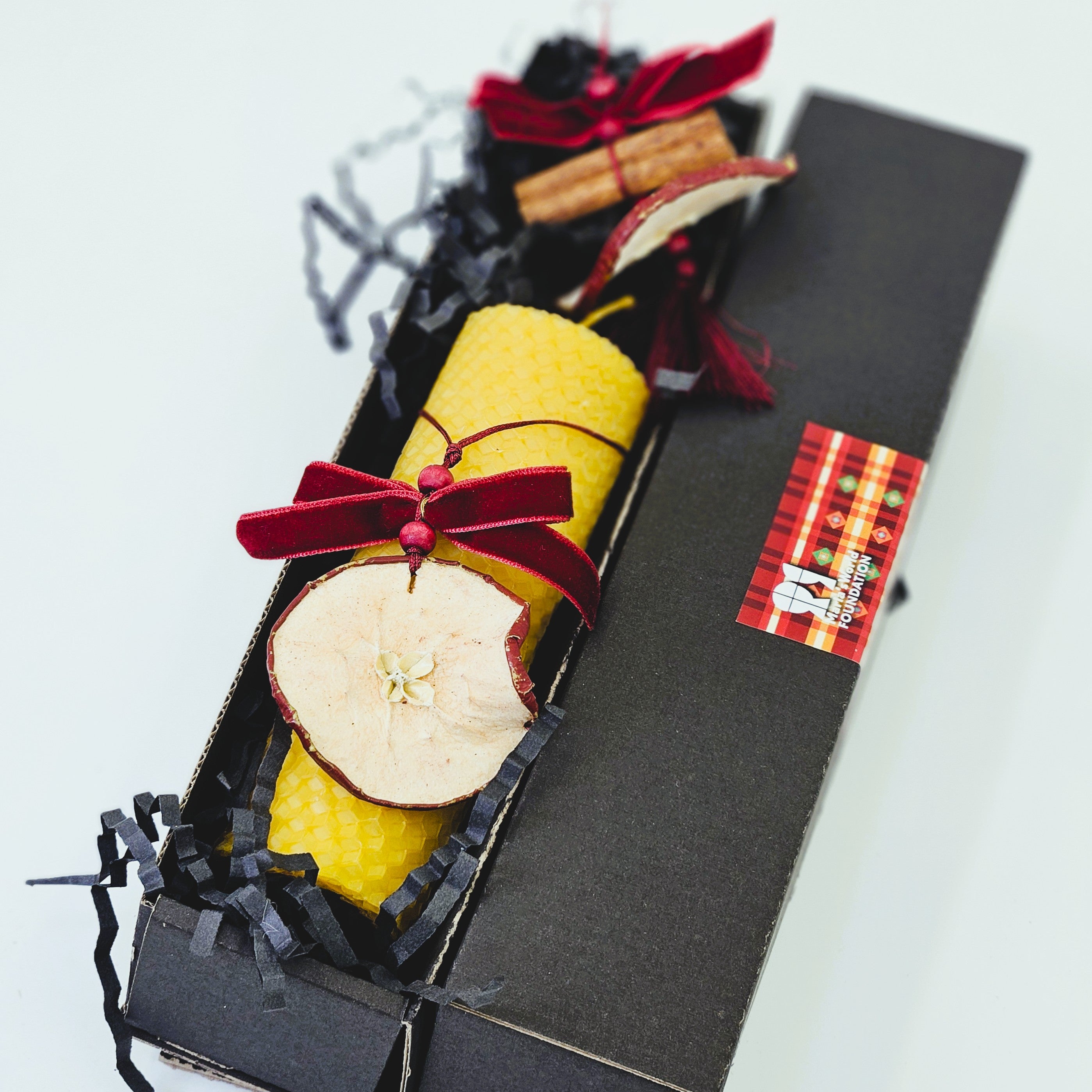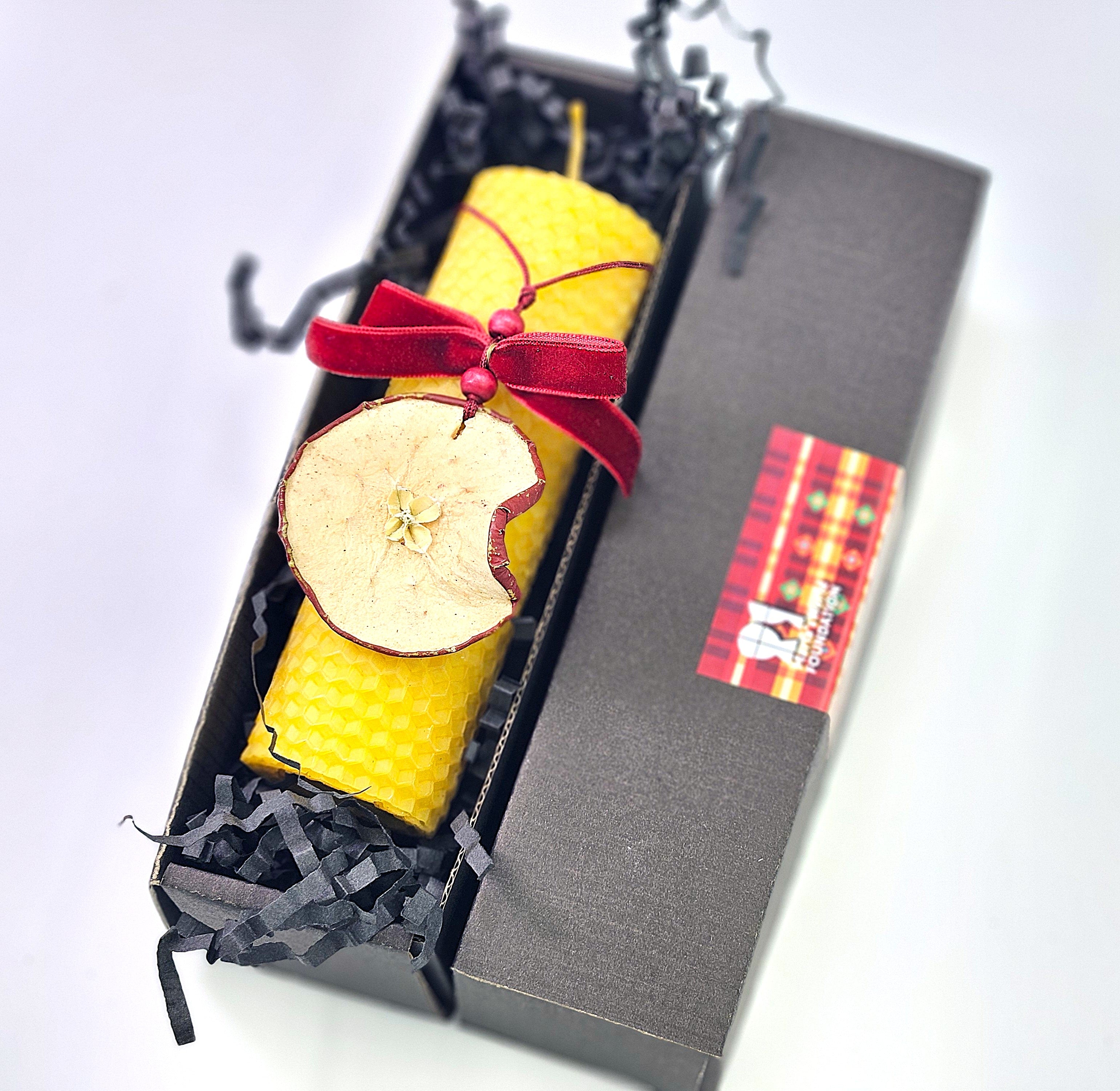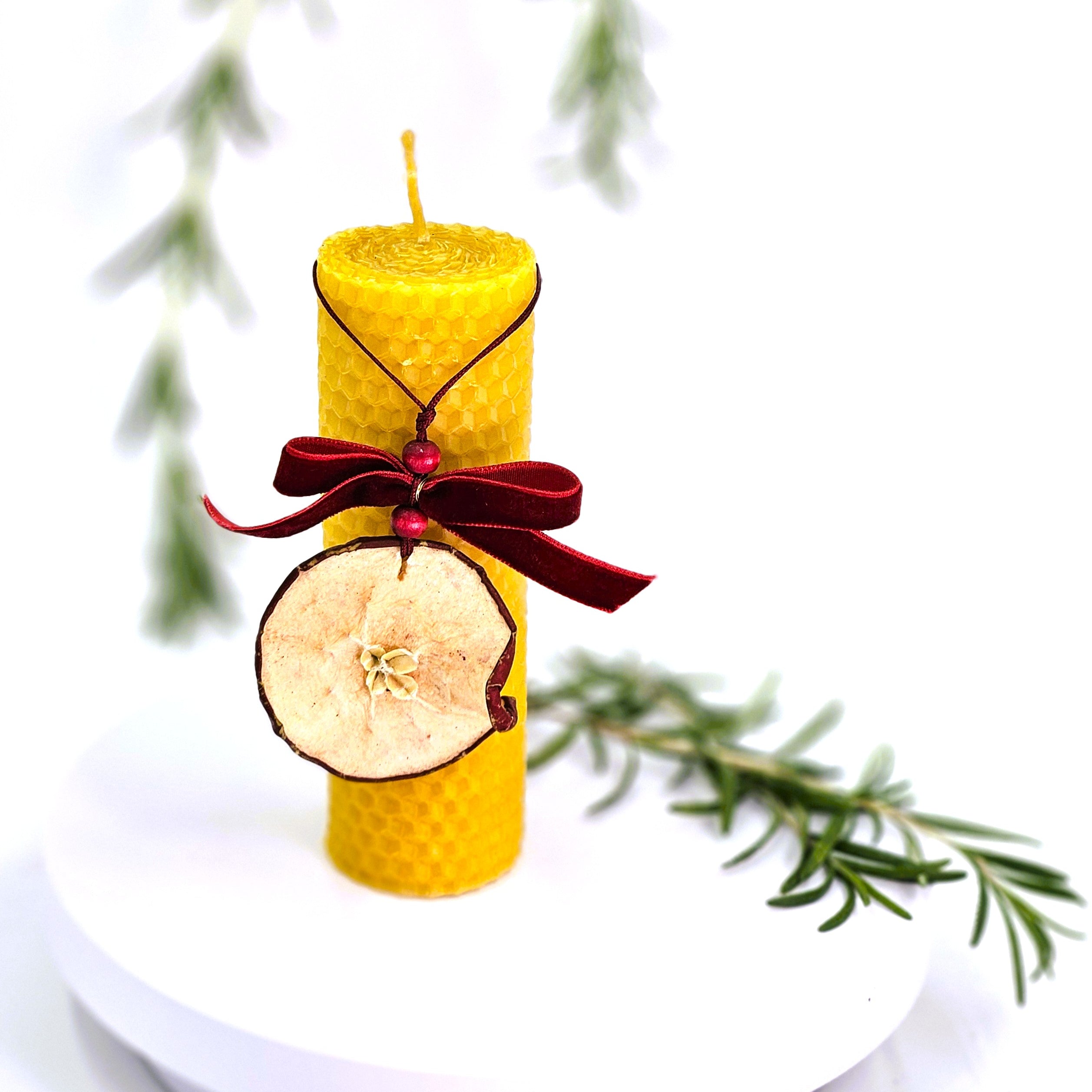 Свещ от пчелен восък с декорация ябълка и панделка в бордо