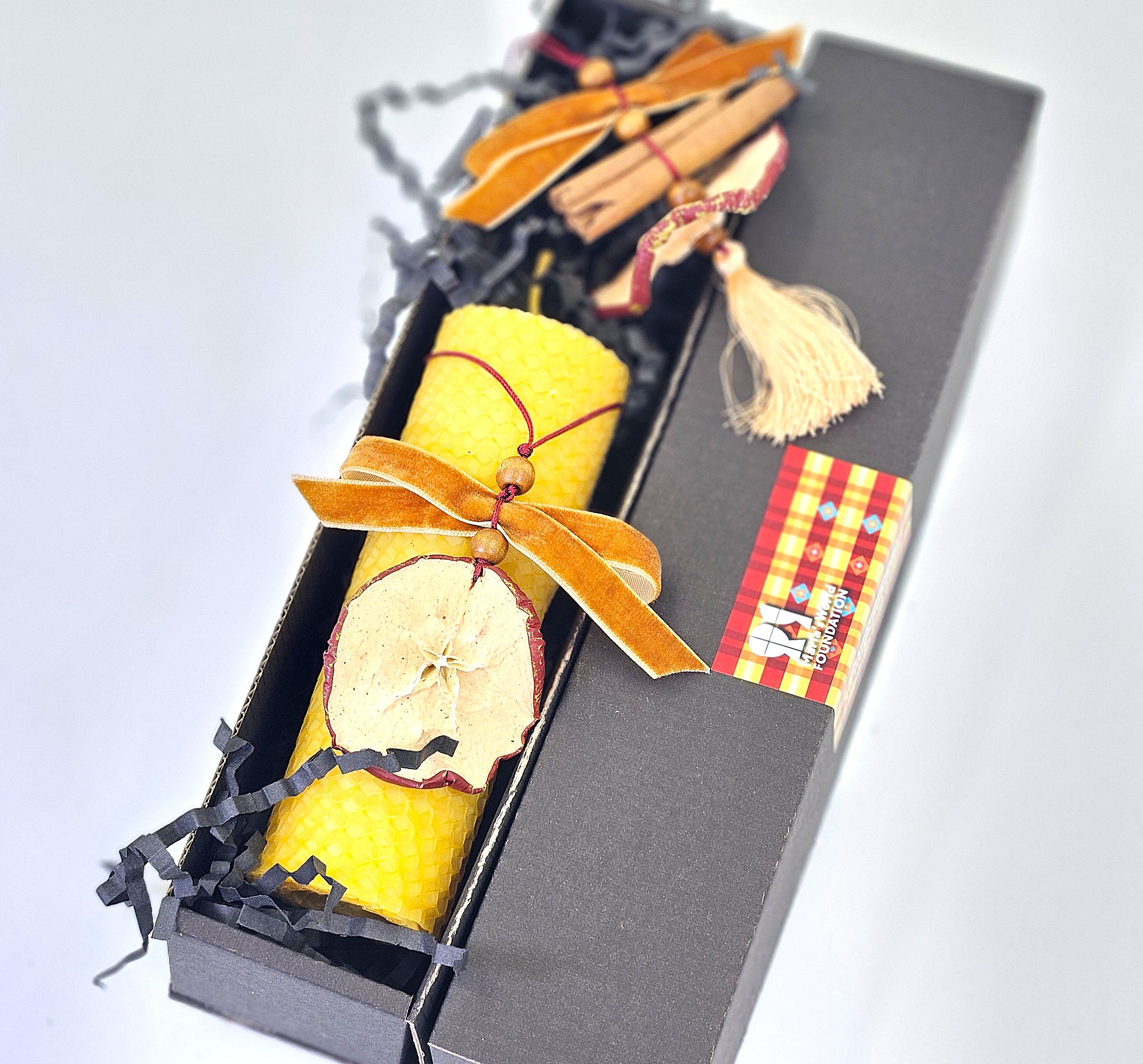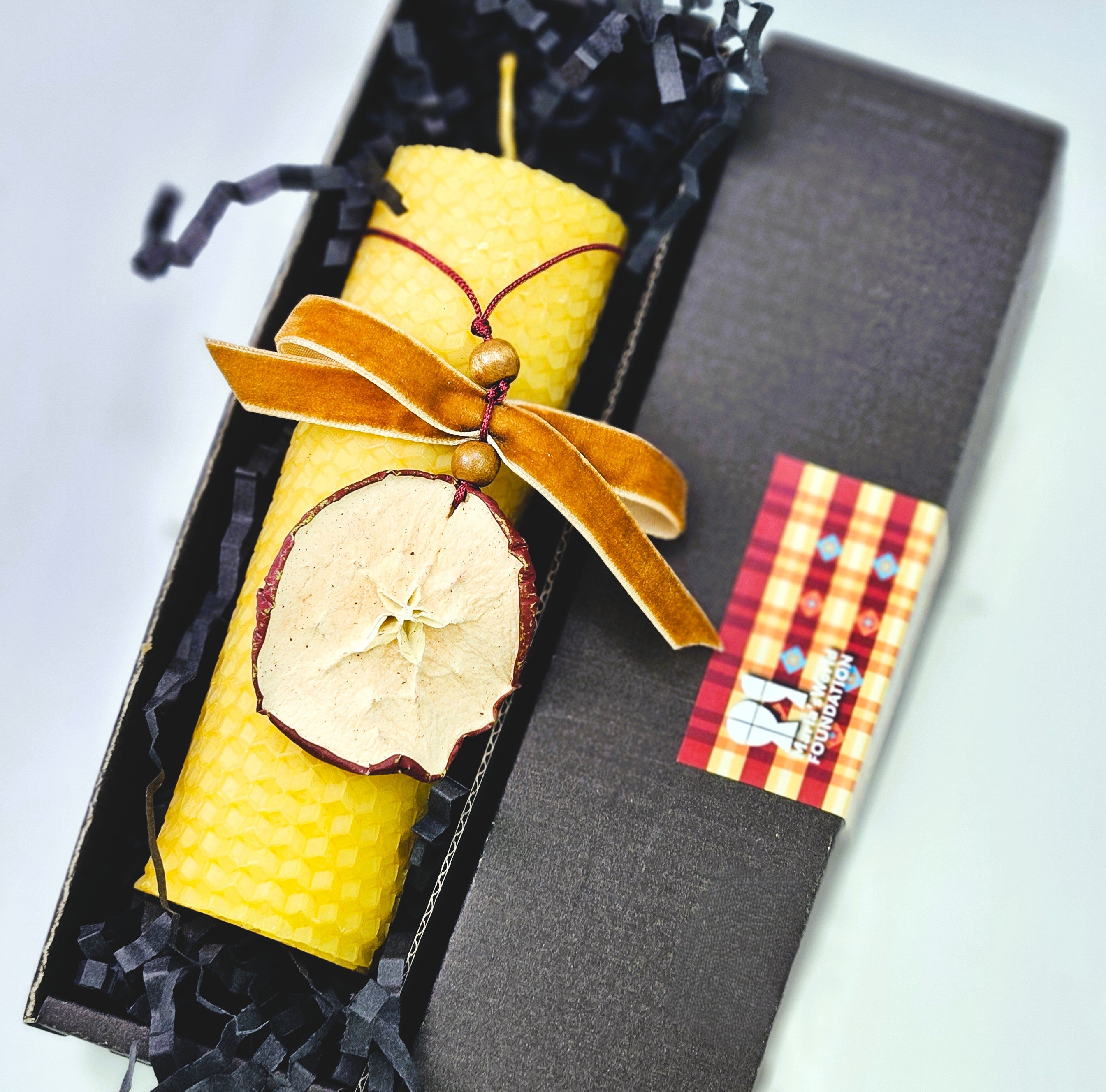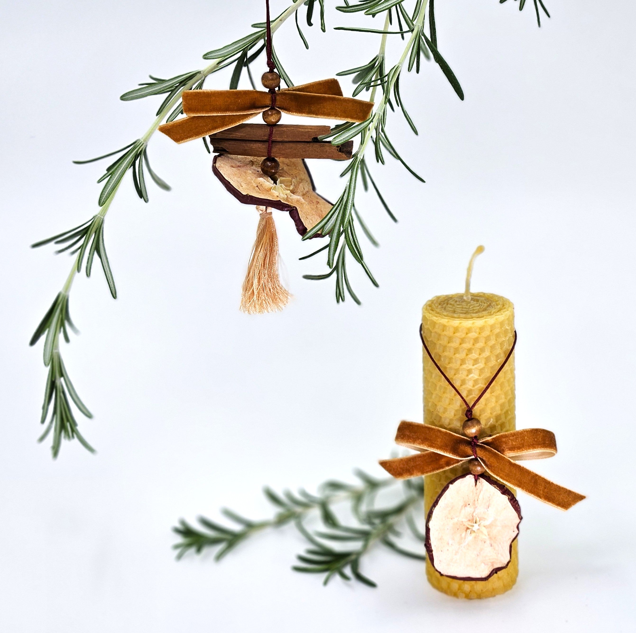 Свещ от пчелен восък с декорация ябълка и панделка медно кадифе