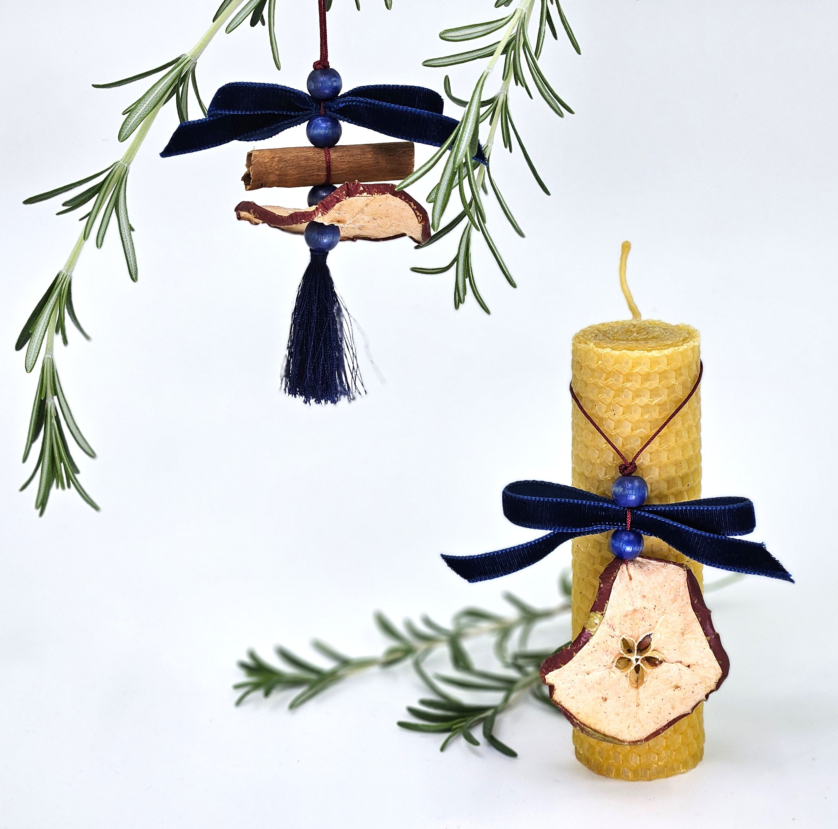 Комплект от свещ и висулка с елегантна декорация ябълка и тъмно синя панделка