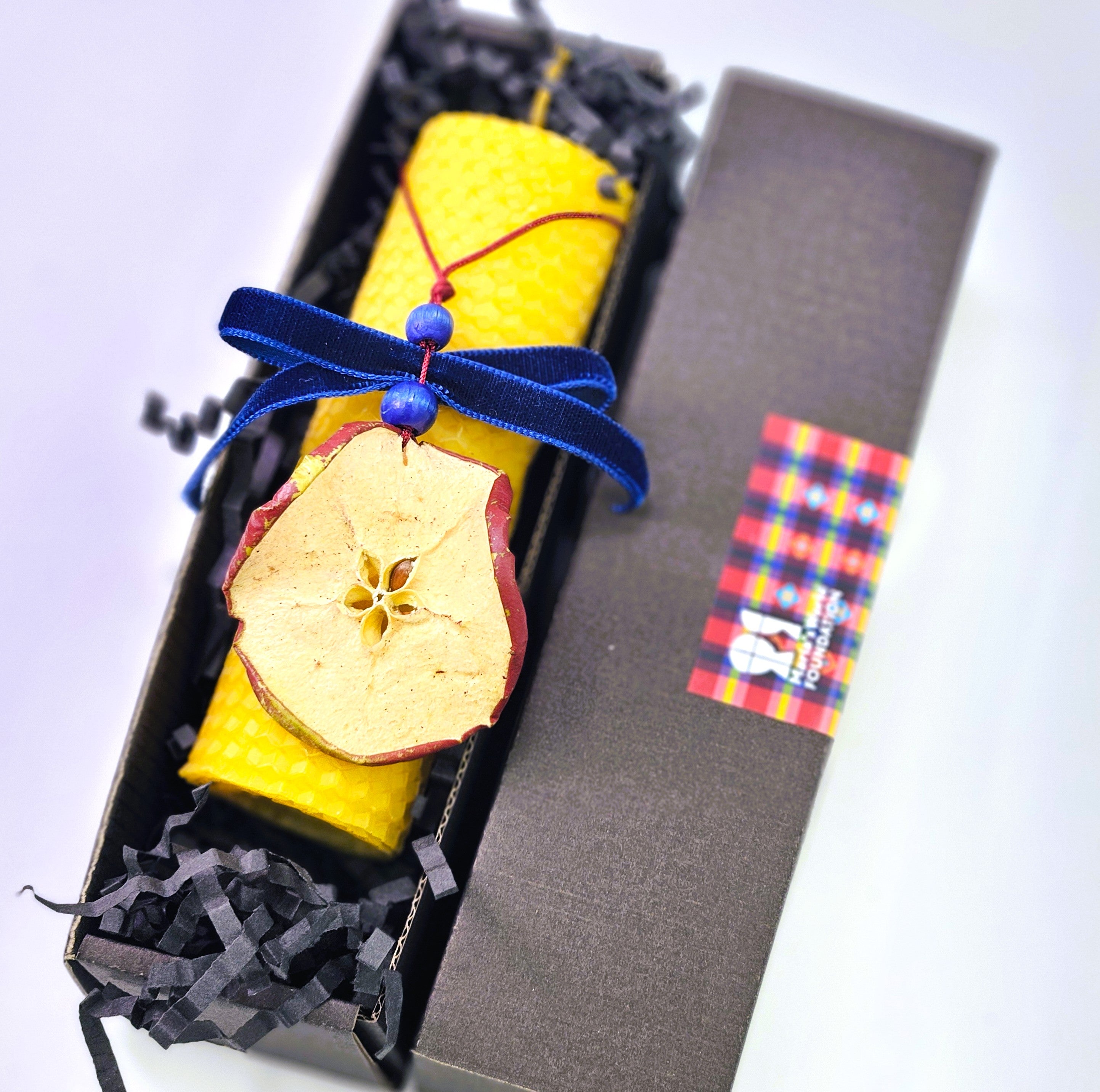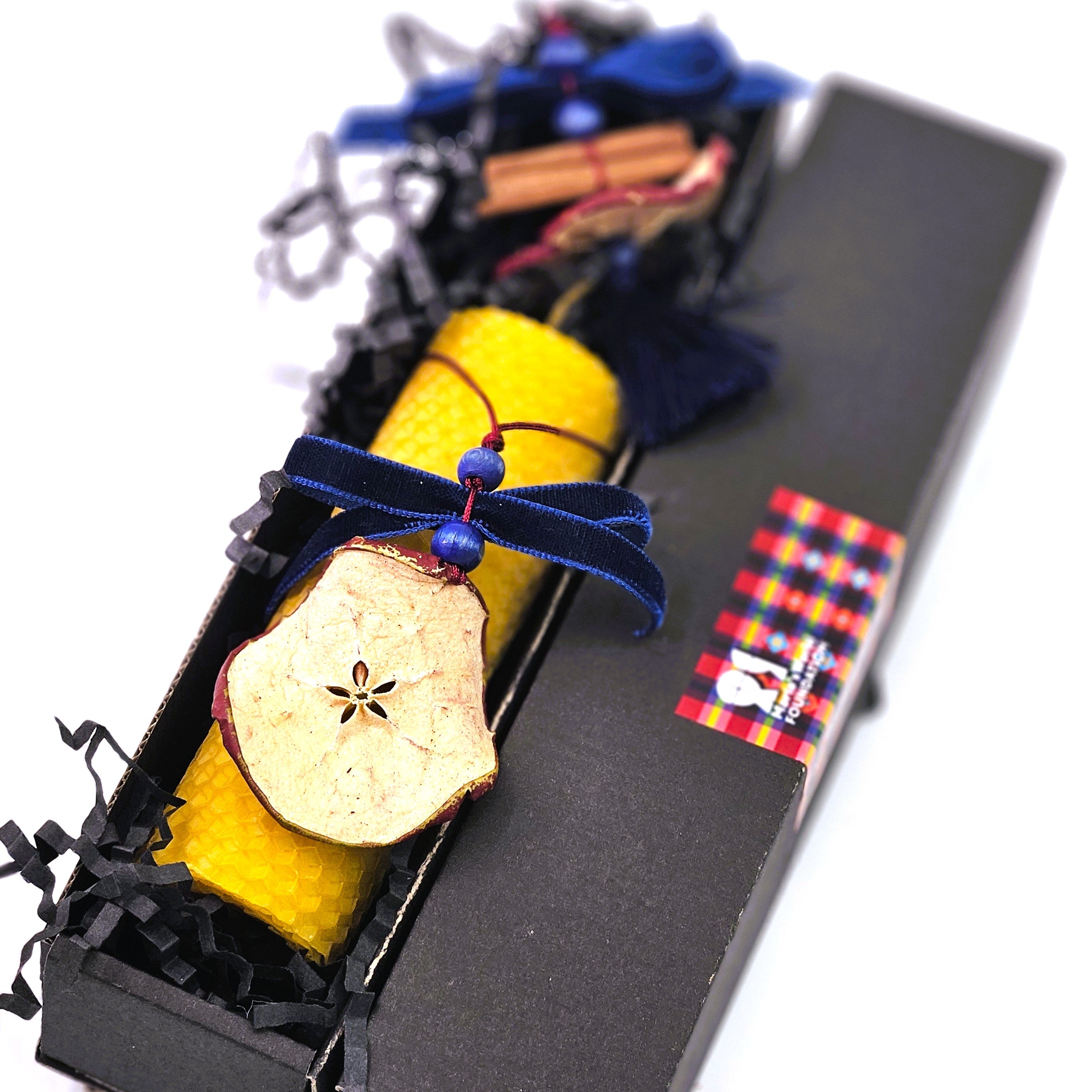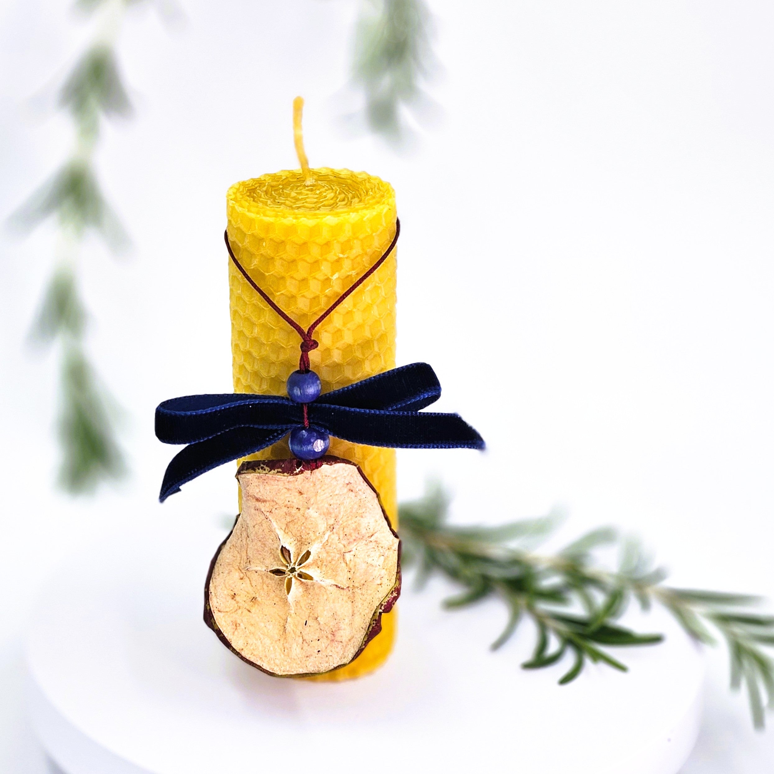 Свещ от пчелен восък с декорация ябълка и тъмно синя панделка