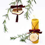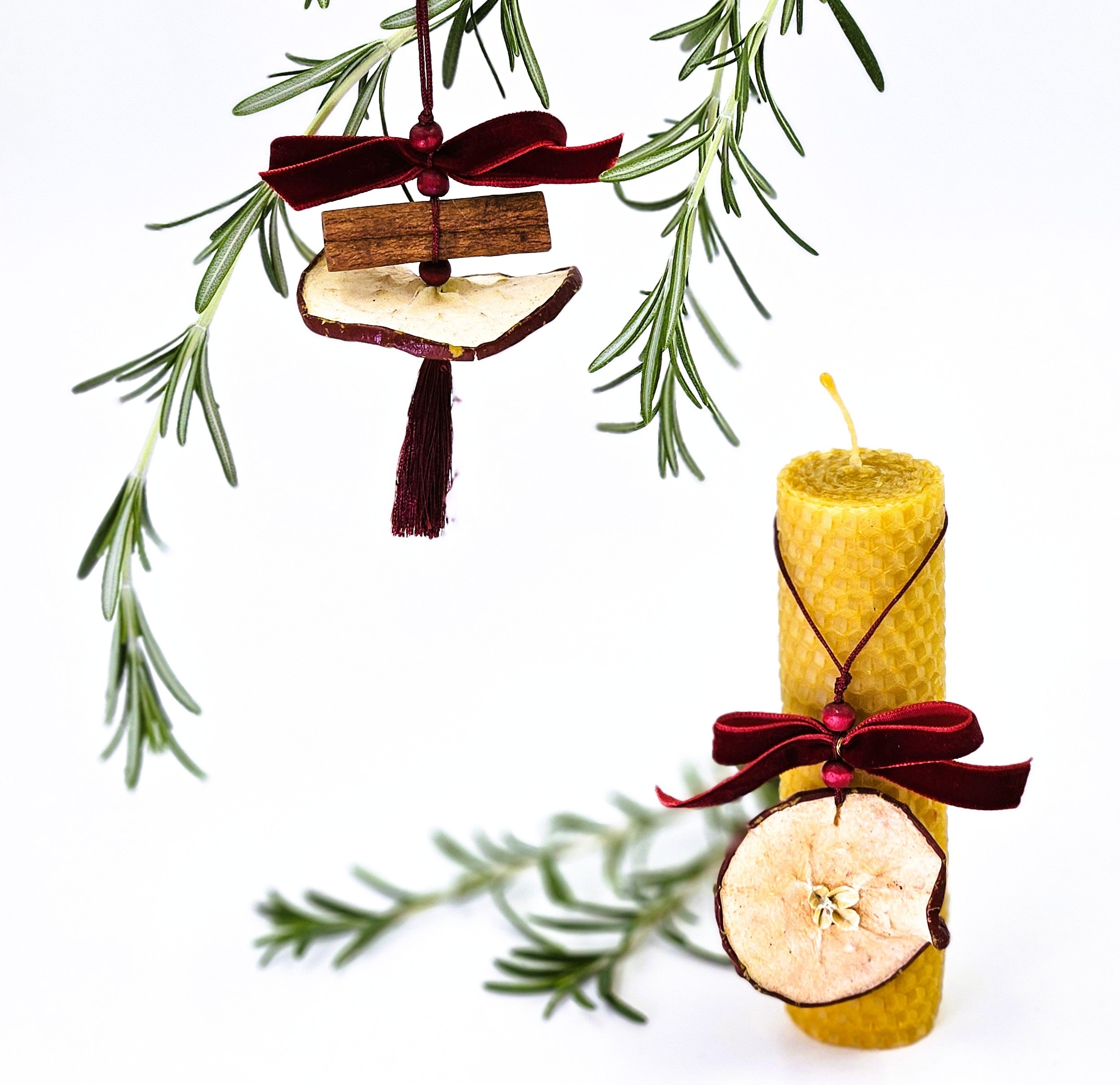 Празничен комплект от восъчна свещ с декорация и висулка от сушена червена ябълка, завършена с кадифена панделка и елегантен пискюл в цвят бордо. Предлагат се и в други цветови комбинации: тъмно синьо и златисто. Красиво опаковани в елегантна черна кутия с черни хартиени стърготини.